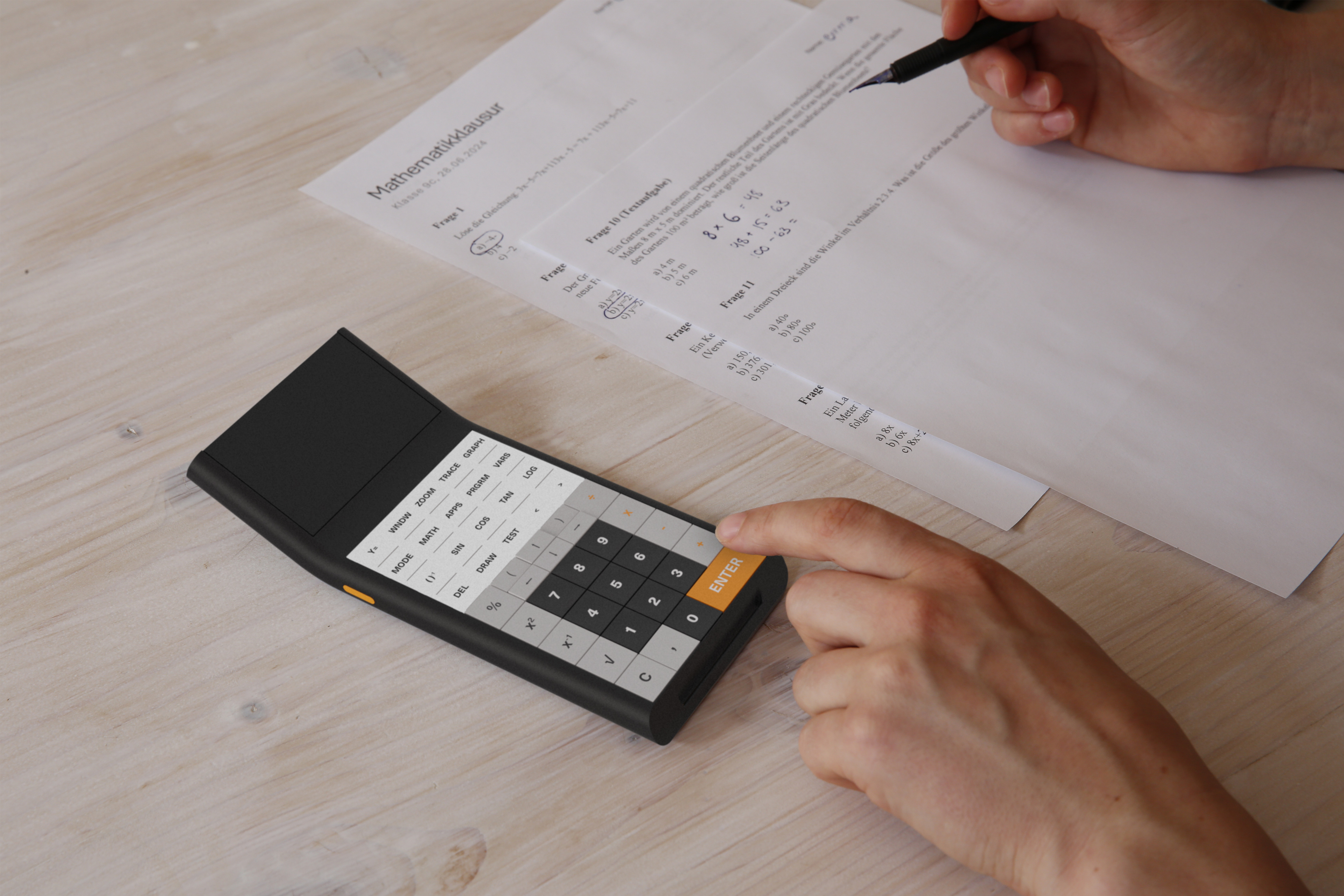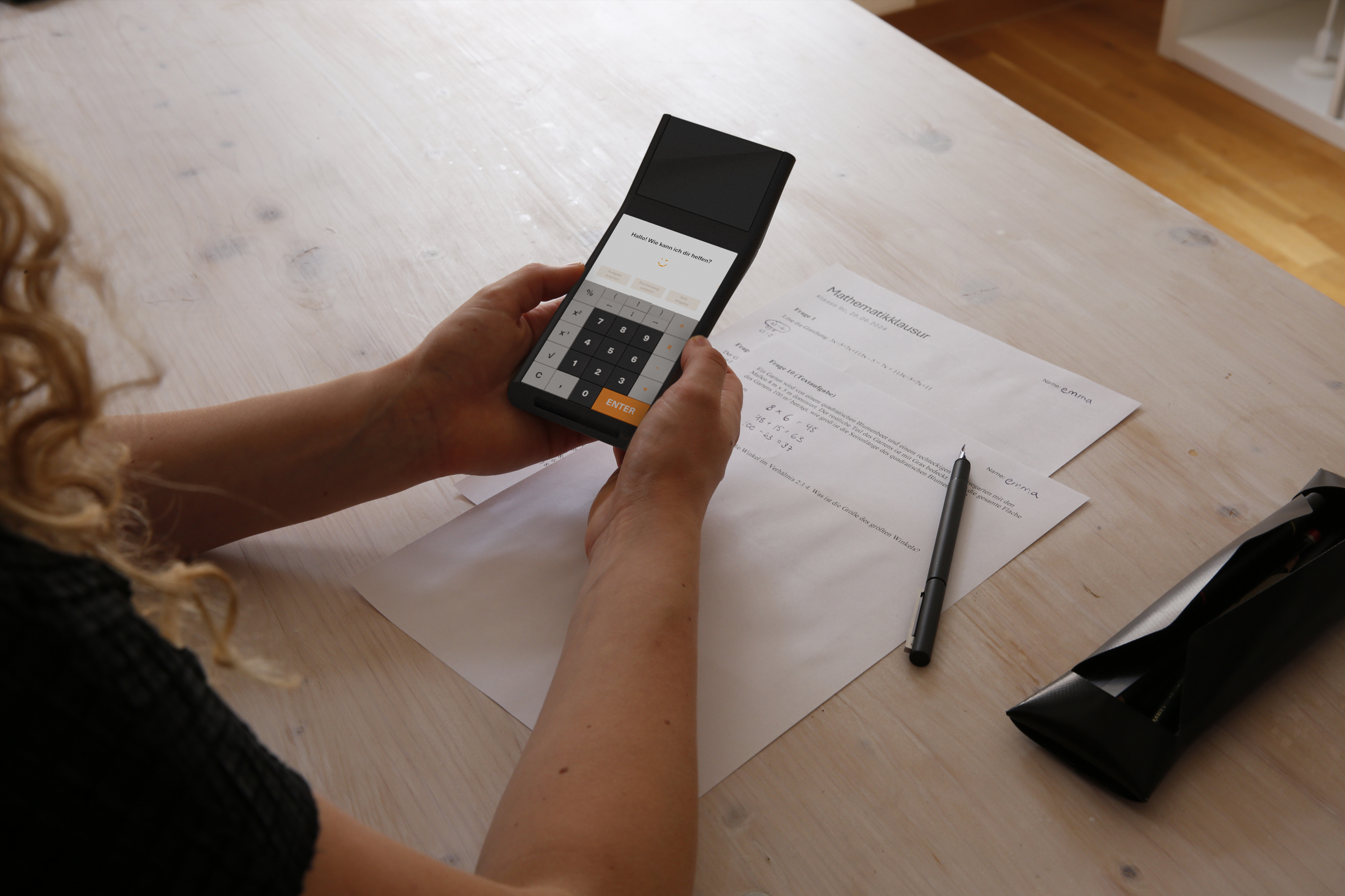 how should a calculator be designed so that users learn to calculate by using it? this question was the basis of this concept. the design plays with the duality of a classic calculator and an ai model, which is shown by the two screens. in normal mode, additional buttons are displayed on the lower paper display. if users press the orange help button on the side, the ai model appears on the lower screen, and they can choose from several options. the calculator can explain the previous calculation steps, scan a problem from a sheet with the camera on the back, or users can draw something with a pen on the screen.